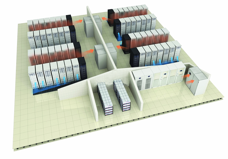 ????? 2、環(huán)境控制系統(tǒng),通常選用機(jī)房精密空調(diào)對數(shù)據(jù)中心的環(huán)境調(diào)節(jié),確保服務(wù)器等IT設(shè)備的運(yùn)行環(huán)境。對于發(fā)熱量大的服務(wù)器等IT設(shè)備,通常選用高通孔率(一般大于70%)網(wǎng)孔門的機(jī)柜,提高機(jī)柜進(jìn)出風(fēng)量;將機(jī)柜面對面、背對背布置,在機(jī)房內(nèi)形成冷熱隔離的風(fēng)道,提高制冷效率;空調(diào)采用下送風(fēng)方式,確保機(jī)房送風(fēng)均勻,提高制冷效率。